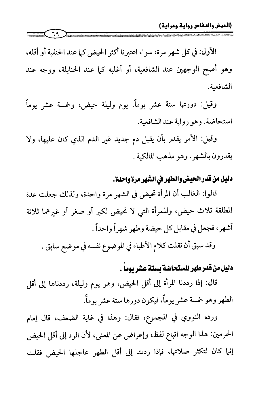 ورده النووي في المجموع، فقال: وهذا في غاية الضعف، قال إمام الحرمين: هذا الوجه اتباع لفظ، وإعراض عن المعنى، لأن الرد إلى أقل الحيض إنّما كان لتكثر صلاتها، فإذا ردت إلى أقل الطهر عاجلها الحيض فقلت