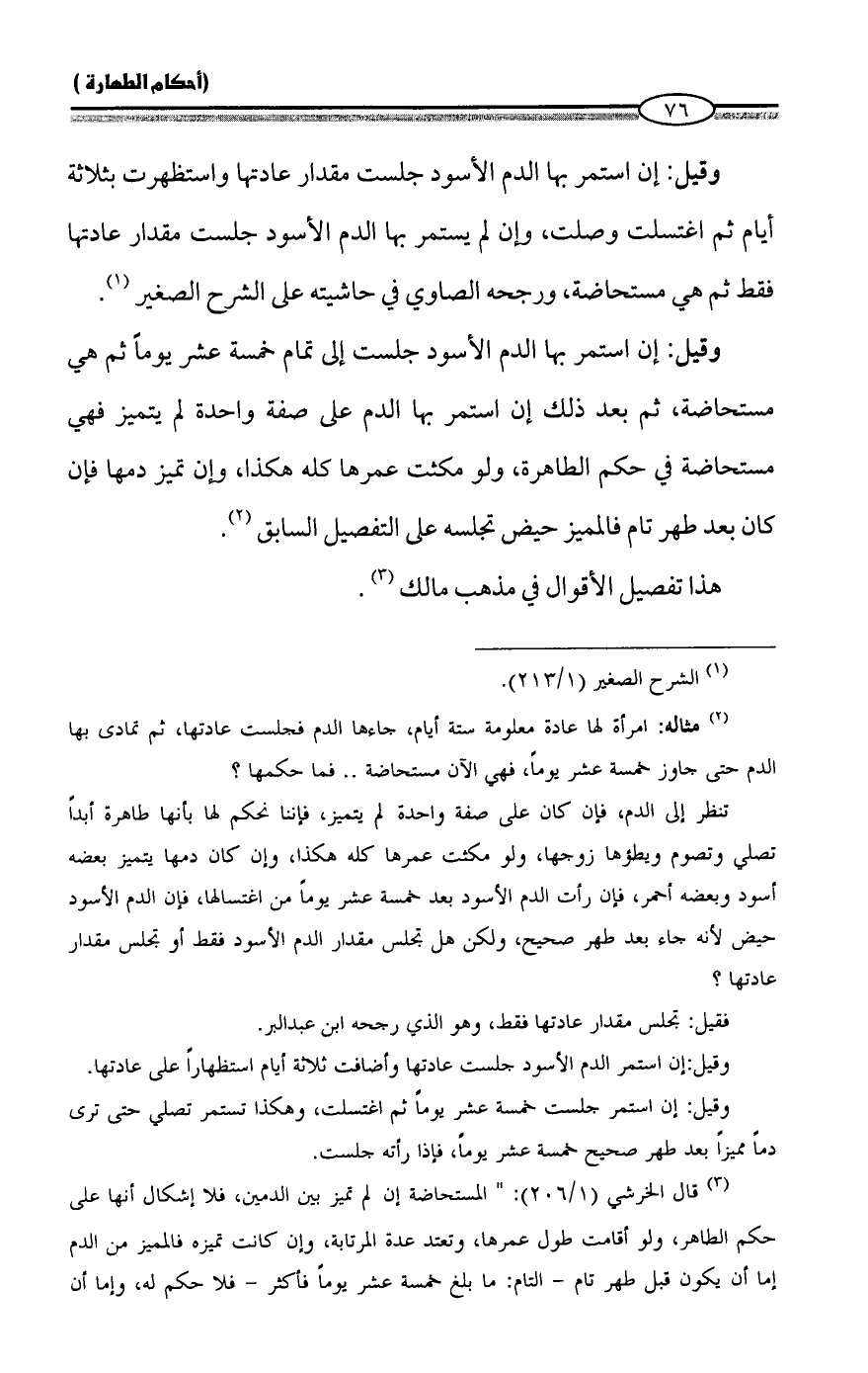وقيل: إن استمر بها الدم الأسود جلست مقدار عادتها واستظهرت بثلاثة أيام ثم اغتسلت وصلت، وإن لم يستمر بها الدم الأسود جلست مقدار عادتها فقط ثم هي مستحاضة، ورجحه الصاوي في حاشيته على الشرح الصغير (¬1).