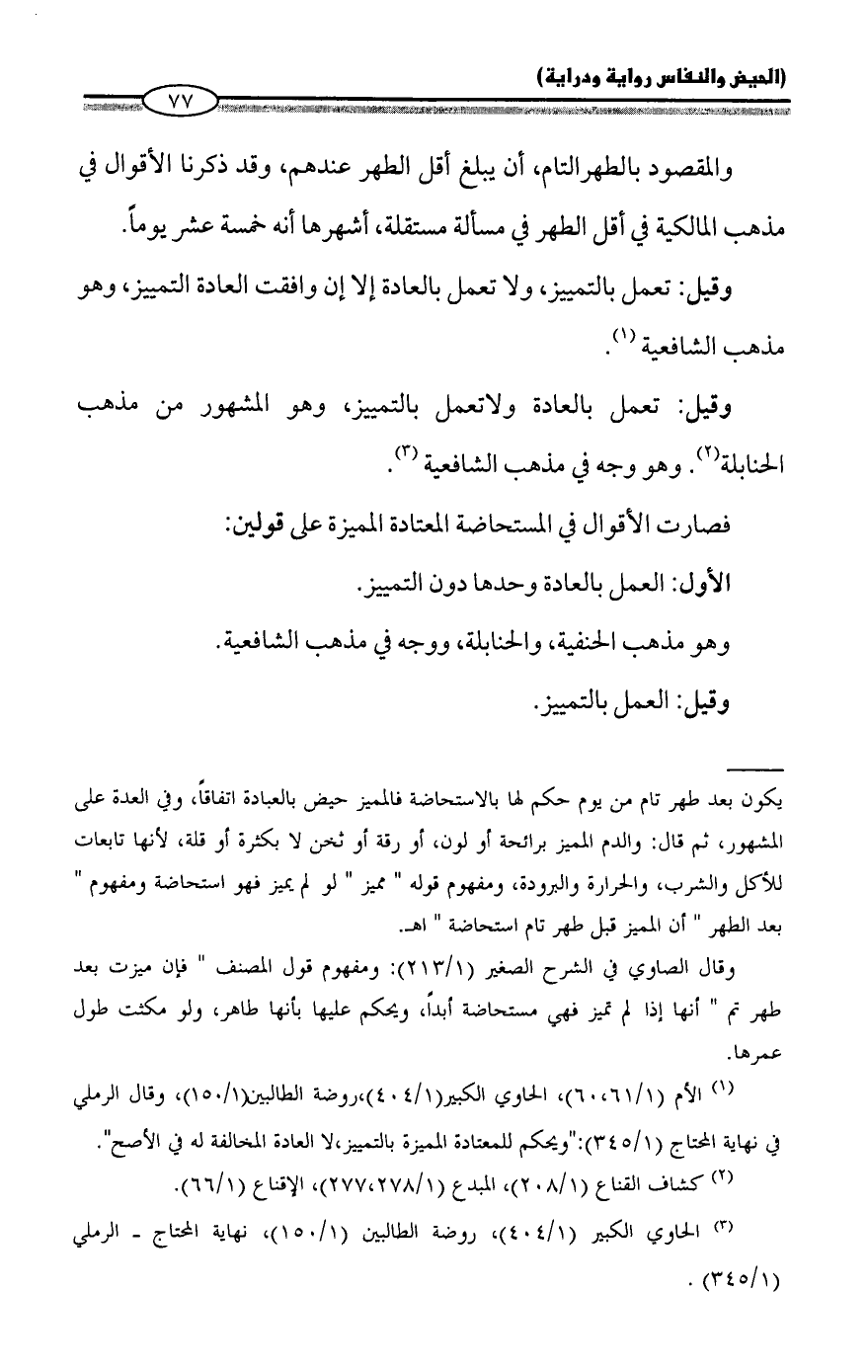 (¬1) الأم (1/ 61، 60)، الحاوي الكبير (1/ 404)، روضة الطالبين (1/ 150)، وقال الرملي في نهاية المحتاج (1/ 345): "ويحكم للمعتادة المميزة بالتمييز، لا العادة المخالفة له في الأصح".
