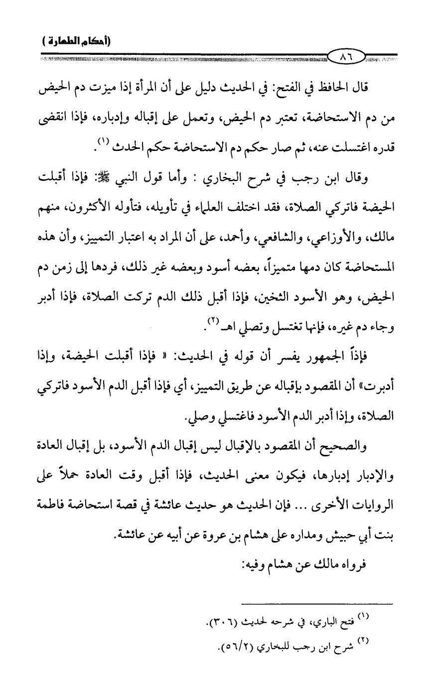 وقال ابن رجب في شرح البخاري: وأما قول النبي - صلى الله عليه وسلم -: فإذا أقبلت الحيضة فاتركي الصلاة، فقد اختلف العلماء في تأويله، فتأوله الأكثرون، منهم مالك، والأوزاعي، والشافعي، وأحمد، على أن المراد به اعتبار التمييز، وأن هذه المستحاضة كان دمها متميزاً، بعضه أسود وبعضه غير ذلك، فردها إلى زمن دم الحيض، وهو الأسود الثخين، فإذا أقبل ذلك الدم تركت الصلاة، فإذا أدبر وجاء دم غيره، فإنها تغتسل وتصلي اهـ (¬2).