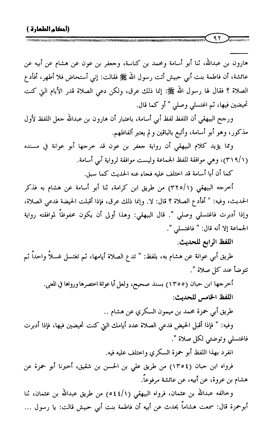 هارون بن عبد الله، ثنا أبو أسامة ومحمد بن كناسة، وجعفر بن عون عن هشام عن أبيه عن عائشة، أن فاطمة بنت أبي حبيش أتت رسول الله - صلى الله عليه وسلم - فقالت: إني أستحاض فلا أطهر، أفأدع الصلاة؟ فقال لها رسول الله - صلى الله عليه وسلم -: إنما ذلك عرق، ولكن دعي الصلاة قدر الأيام التي كنت تحيضين فيها، ثم اغتسلي وصلي" أو كما قال.