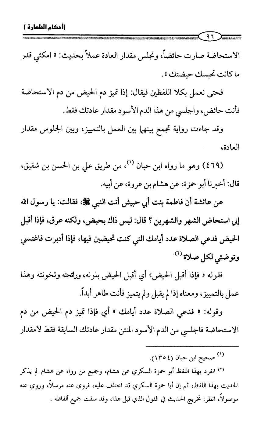 عن عائشة أن فاطمة بنت أبي حبيش أتت النبي - صلى الله عليه وسلم -، فقالت: يا رسول الله إني استحاض الشهر والشهرين؟ قال: ليس ذاك بحيض، ولكنه عرق، فإذا أقبل الحيض فدعي الصلاة عدد أيامك التي كنت تحيضين فيها، فإذا أدبرت فاغتسلي وتوضئي لكل صلاة (¬2).