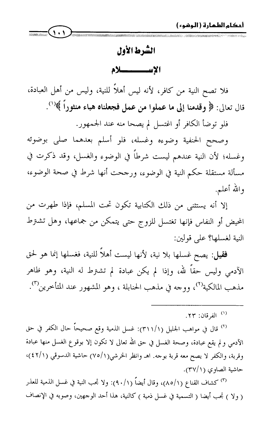 (¬2) قال في مواهب الجليل (1/ 311): غسل الذمية وقع صحيحاً حال الكفر في حق الآدمي ولم يقع عبادة، وصحة الغسل في حق الله تعالى لا تكون إلا بوقوع الغسل منها عبادة وقربة، والكفر لا يصح معه قربة بوجه. اهـ وانظر الخرشي (1/ 75) حاشية الدسوقي (1/ 42)، حاشية الصاوي (1/ 37).