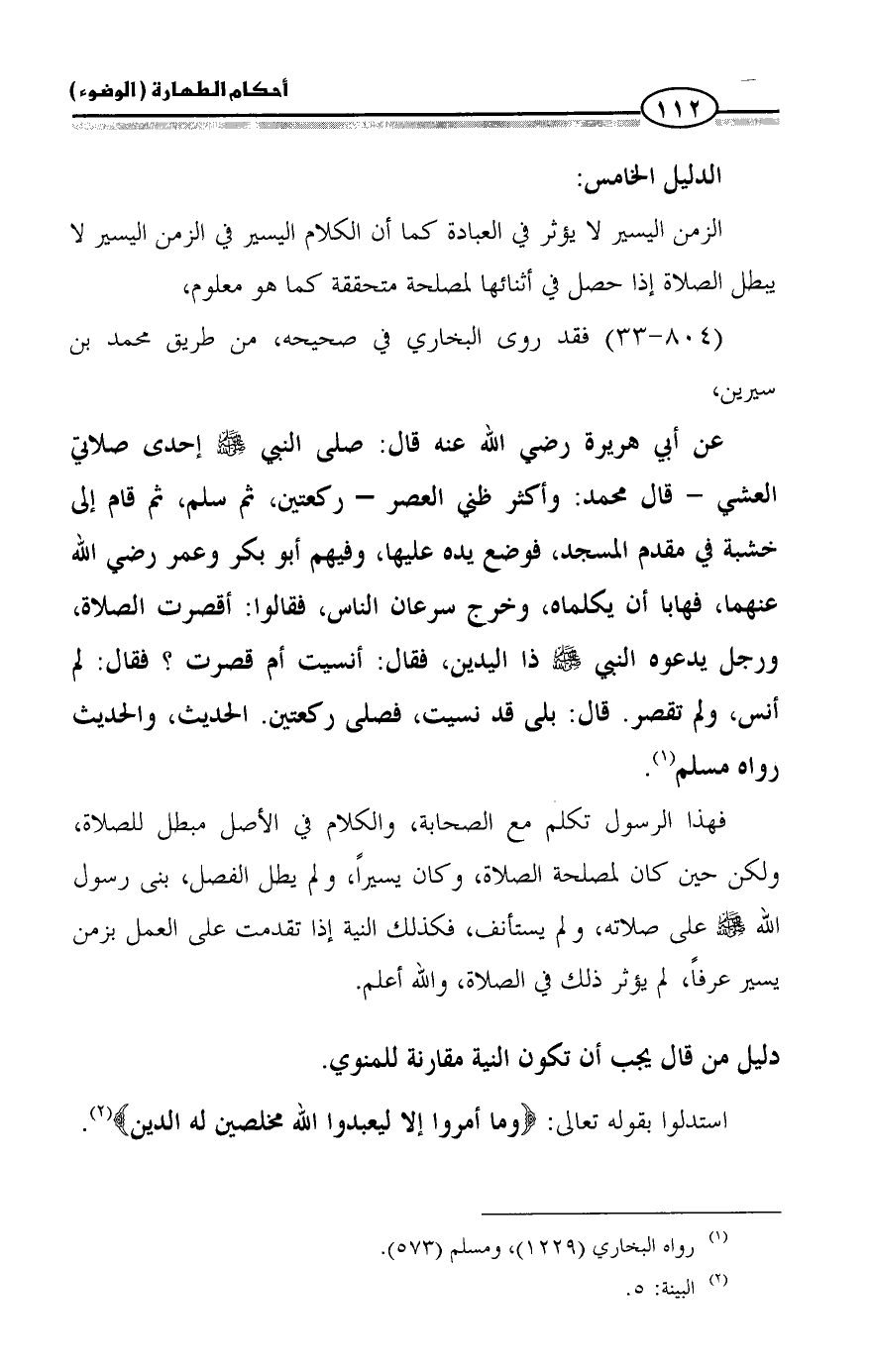 فهذا الرسول تكلم مع الصحابة، والكلام في الأصل مبطل للصلاة، ولكن حين كان لمصلحة الصلاة، وكان يسيراً، ولم يطل الفصل، بنى رسول الله - صلى الله عليه وسلم - على صلاته، ولم يستأنف، فكذلك النية إذا تقدمت على العمل بزمن يسير عرفاً، لم يؤثر ذلك في الصلاة، والله أعلم.