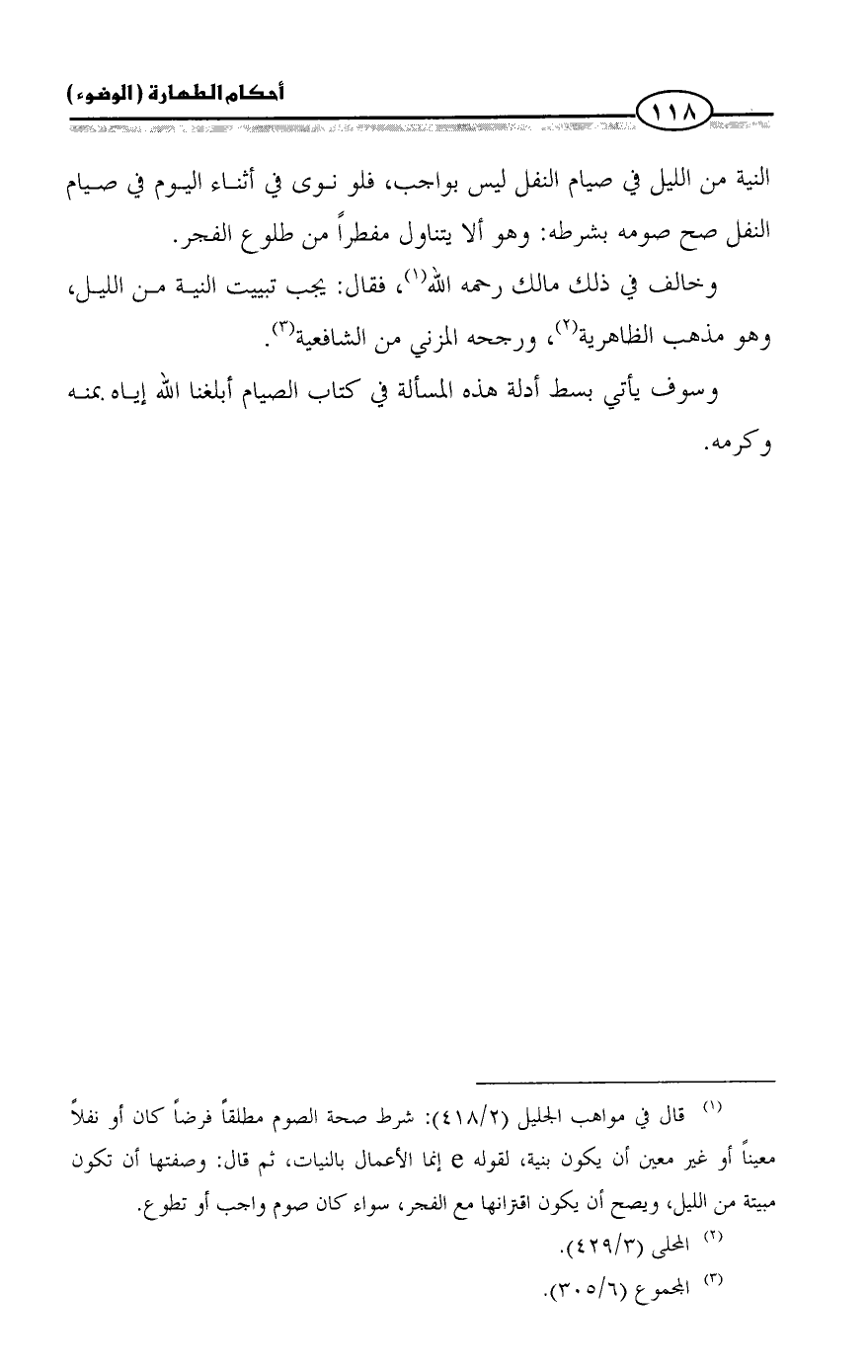(¬1) قال في مواهب الجليل (2/ 418): شرط صحة الصوم مطلقاً فرضاً كان أو نفلاً معيناً أو غير معين أن يكون بنية، لقوله e إنما الأعمال بالنيات، ثم قال: وصفتها أن تكون مبيتة من الليل، ويصح أن يكون اقترانها مع الفجر، سواء كان صوم واجب أو تطوع.