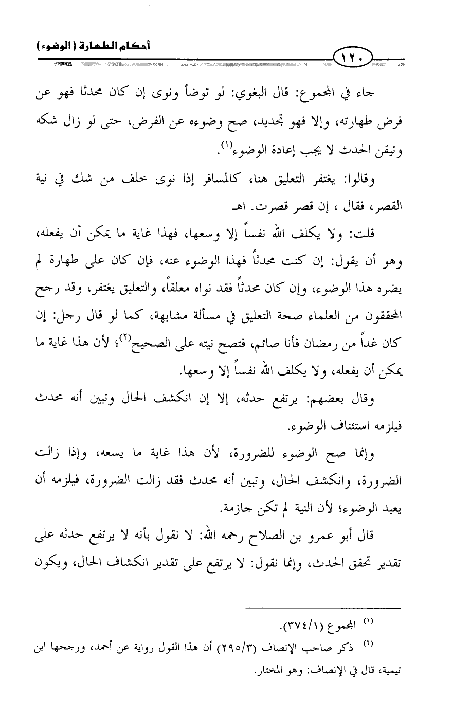 قلت: ولا يكلف الله نفساً إلا وسعها، فهذا غاية ما يمكن أن يفعله، وهو أن يقول: إن كنت محدثاً فهذا الوضوء عنه، فإن كان على طهارة لم يضره هذا الوضوء، وإن كان محدثاً فقد نواه معلقاً، والتعليق يغتفر، وقد رجح المحققون من العلماء صحة التعليق في مسألة مشابهة، كما لو قال رجل: إن كان غداً من رمضان فأنا صائم، فتصح نيته على الصحيح (¬2)؛ لأن هذا غاية ما يمكن أن يفعله، ولا يكلف الله نفساً إلا وسعها.