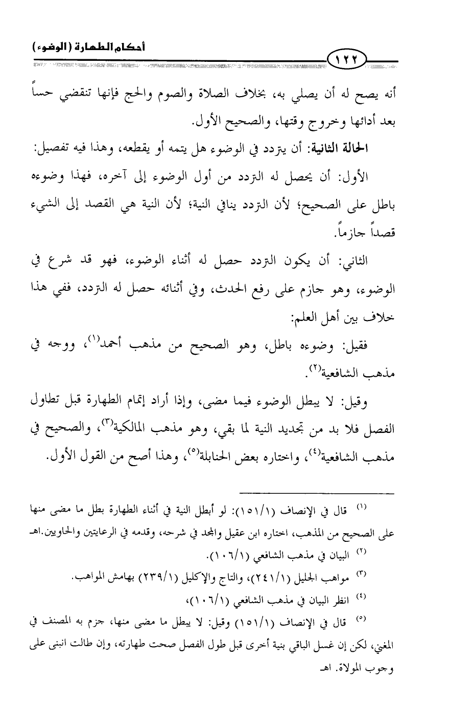 (¬1) قال في الإنصاف (1/ 151): لو أبطل النية في أثناء الطهارة بطل ما مضى منها على الصحيح من المذهب، اختاره ابن عقيل والمجد في شرحه، وقدمه في الرعايتين والحاويين. اهـ
