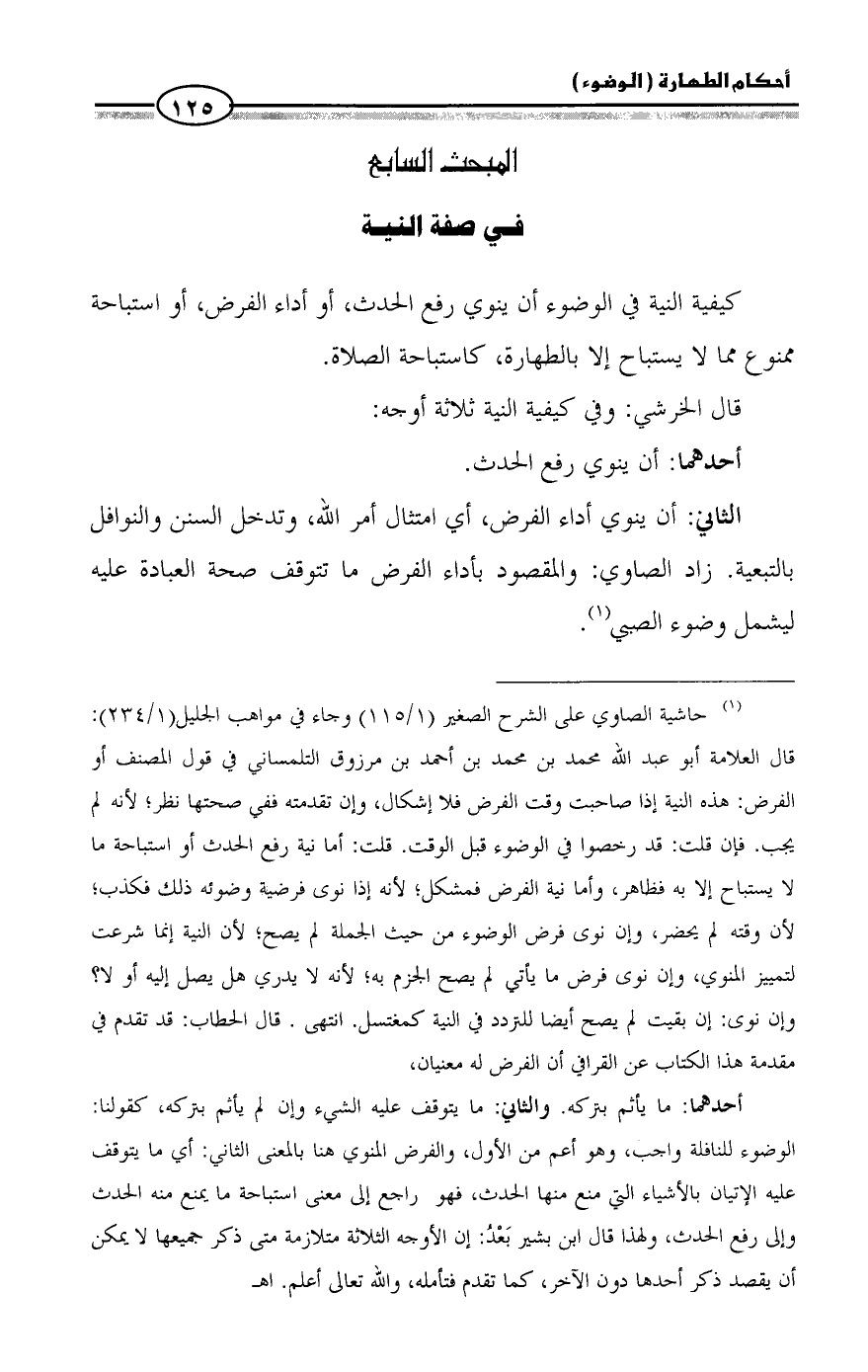 (¬1) حاشية الصاوي على الشرح الصغير (1/ 115) وجاء في مواهب الجليل (1/ 234): قال العلامة أبو عبد الله محمد بن محمد بن أحمد بن مرزوق التلمساني في قول المصنف أو الفرض: هذه النية إذا صاحبت وقت الفرض فلا إشكال، وإن تقدمته ففي صحتها نظر; لأنه لم يجب. فإن قلت: قد رخصوا في الوضوء قبل الوقت. قلت: أما نية رفع الحدث أو استباحة ما لا يستباح إلا به فظاهر, وأما نية الفرض فمشكل; لأنه إذا نوى فرضية وضوئه ذلك فكذب; لأن وقته لم يحضر, وإن نوى فرض الوضوء من حيث الجملة لم يصح; لأن النية إنما شرعت لتمييز المنوي, وإن نوى فرض ما يأتي لم يصح الجزم به; لأنه لا يدري هل يصل إليه أو لا؟ وإن نوى: إن بقيت لم يصح أيضا للتردد في النية كمغتسل. انتهى. قال الحطاب: قد تقدم في مقدمة هذا الكتاب عن القرافي أن الفرض له معنيان،