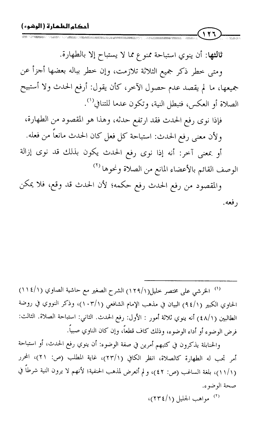 (¬1) الخرشي على مختصر خليل (1/ 129) الشرح الصغير مع حاشية الصاوي (1/ 114) الحاوي الكبير (1/ 94) البيان في مذهب الإمام الشافعي (1/ 103)، وذكر النووي في روضة الطالبين (1/ 48) أنه ينوي ثلاثة أمور: الأول: رفع الحدث. الثاني: استباحة الصلاة. الثالث: فرض الوضوء أو أداء الوضوء، وذلك كاف قطعاً، وإن كان الناوي صبياً.