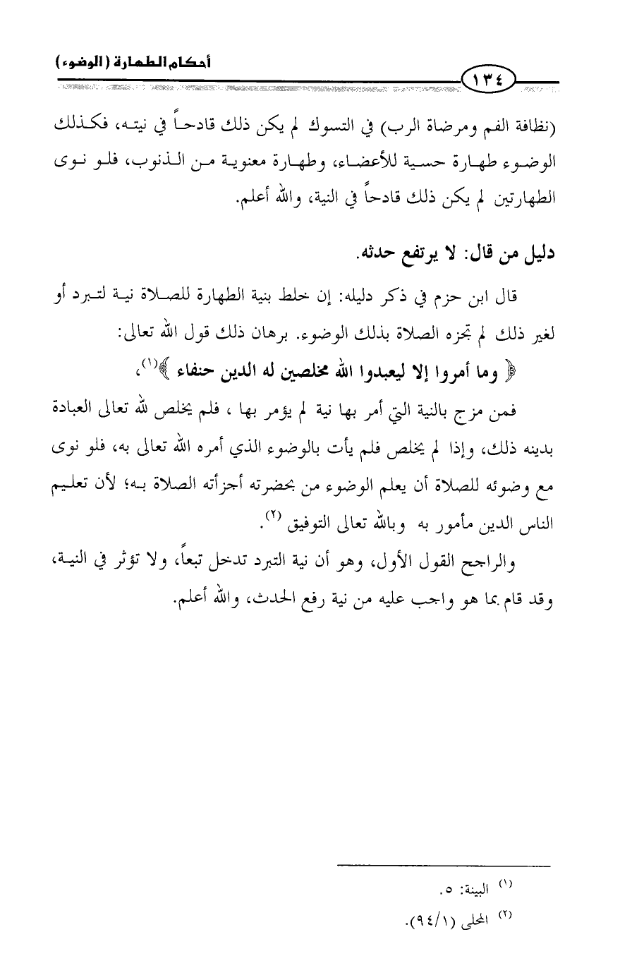 قال ابن حزم في ذكر دليله: إن خلط بنية الطهارة للصلاة نية لتبرد أو لغير ذلك لم تجزه الصلاة بذلك الوضوء. برهان ذلك قول الله تعالى: