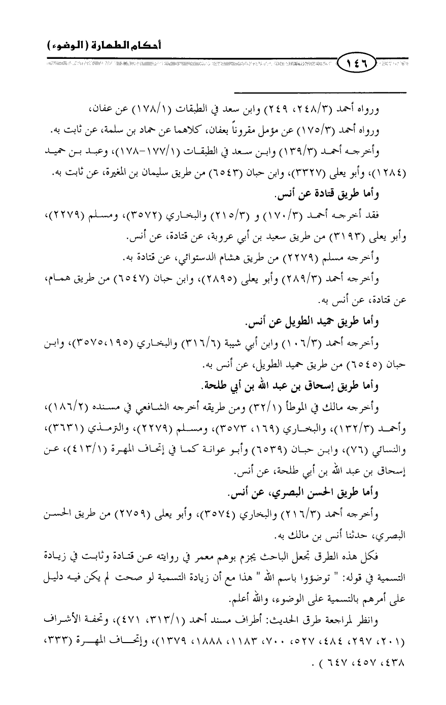 فكل هذه الطرق تجعل الباحث يجزم بوهم معمر في روايته عن قتادة وثابت في زيادة التسمية في قوله: " توضؤوا باسم الله " هذا مع أن زيادة التسمية لو صحت لم يكن فيه دليل على أمرهم بالتسمية على الوضوء، والله أعلم.