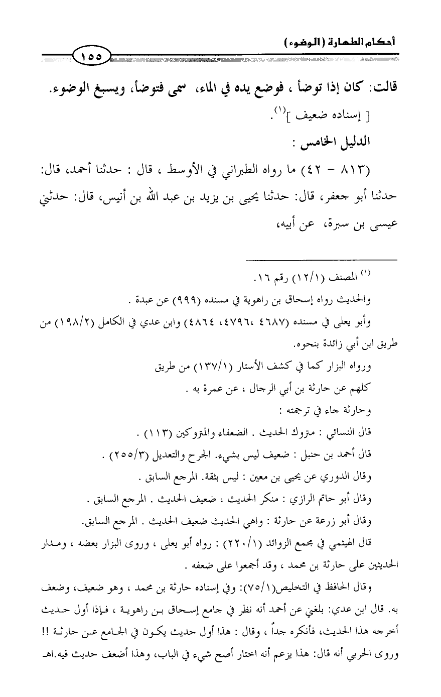 وقال الحافظ في التخليص (1/ 75): وفي إسناده حارثة بن محمد، وهو ضعيف، وضعف به. قال ابن عدي: بلغني عن أحمد أنه نظر في جامع إسحاق بن راهوية، فإذا أول حديث أخرجه هذا الحديث، فأنكره جداً، وقال: هذا أول حديث يكون في الجامع عن حارثة!! وروى الحربي أنه قال: هذا يزعم أنه اختار أصح شيء في الباب، وهذا أضعف حديث فيه. اهـ