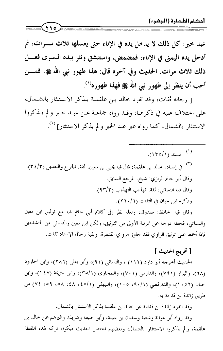 [رجاله ثقات، وقد تفرد خالد بن علقمة بذكر الاستنثار بالشمال، على اختلاف عليه في ذكرها، وقد رواه جماعة عن عبد خير ولم يذكروا الاستنثار بالشمال، كما رواه غير عبد الخير ولم يذكر الاستنثار] (¬2).