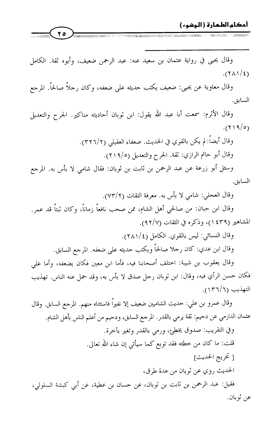 وقال يعقوب بن شيبة: اختلف أصحابنا فيه، فأما ابن معين فكان يضعفه، وأما علي فكان حسن الرأي فيه، وقال: ابن ثوبان رجل صدق لا بأس به، وقد حمل عنه الناس. تهذيب التهذيب (6/ 136).