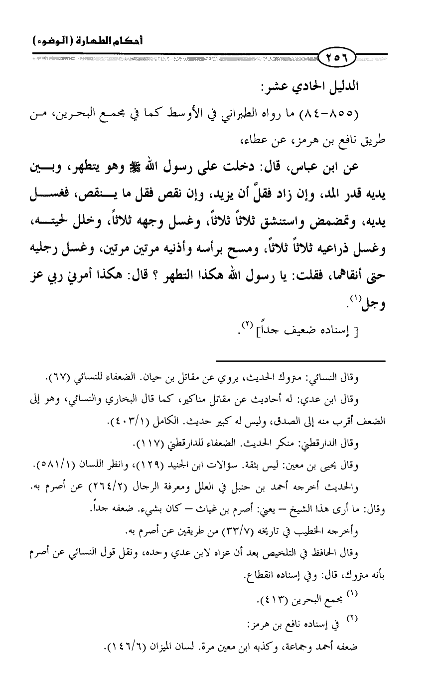 عن ابن عباس، قال: دخلت على رسول الله - صلى الله عليه وسلم - وهو يتطهر، وبين يديه قدر المد، وإن زاد فقلَّ أن يزيد، وإن نقص فقل ما ينقص، فغسل يديه، وتمضمض واستنشق ثلاثاً ثلاثاً، وغسل وجهه ثلاثاً، وخلل لحيته، وغسل ذراعيه ثلاثاً ثلاثاً، ومسح برأسه وأذنيه مرتين مرتين، وغسل رجليه حتى أنقاهما، فقلت: يا رسول الله هكذا التطهر؟ قال: هكذا أمرني ربي عز وجل (¬1).