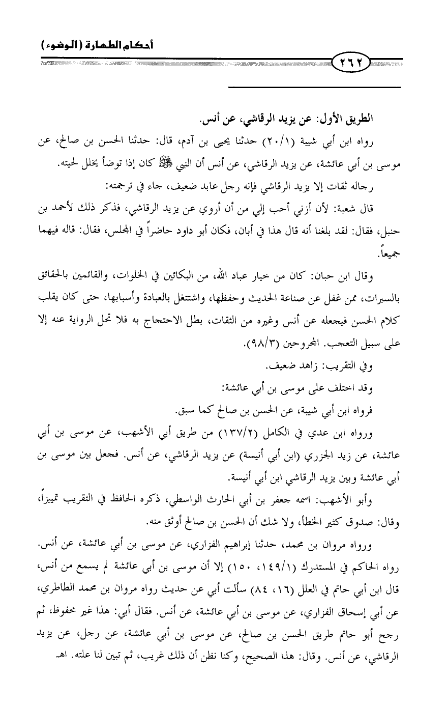 ورواه مروان بن محمد، حدثنا إبراهيم الفزاري، عن موسى بن أبي عائشة، عن أنس. رواه الحاكم في المستدرك (1/ 149، 150) إلا أن موسى بن أبي عائشة لم يسمع من أنس، قال ابن أبي حاتم في العلل (16، 84) سألت أبي عن حديث رواه مروان بن محمد الطاطري، عن أبي إسحاق الفزاري، عن موسى بن أبي عائشة، عن أنس. فقال أبي: هذا غير محفوظ، ثم رجح أبو حاتم طريق الحسن بن صالح، عن موسى بن أبي عائشة، عن رجل، عن يزيد الرقاشي، عن أنس. وقال: هذا الصحيح، وكنا نظن أن ذلك غريب، ثم تبين لنا علته. اهـ =