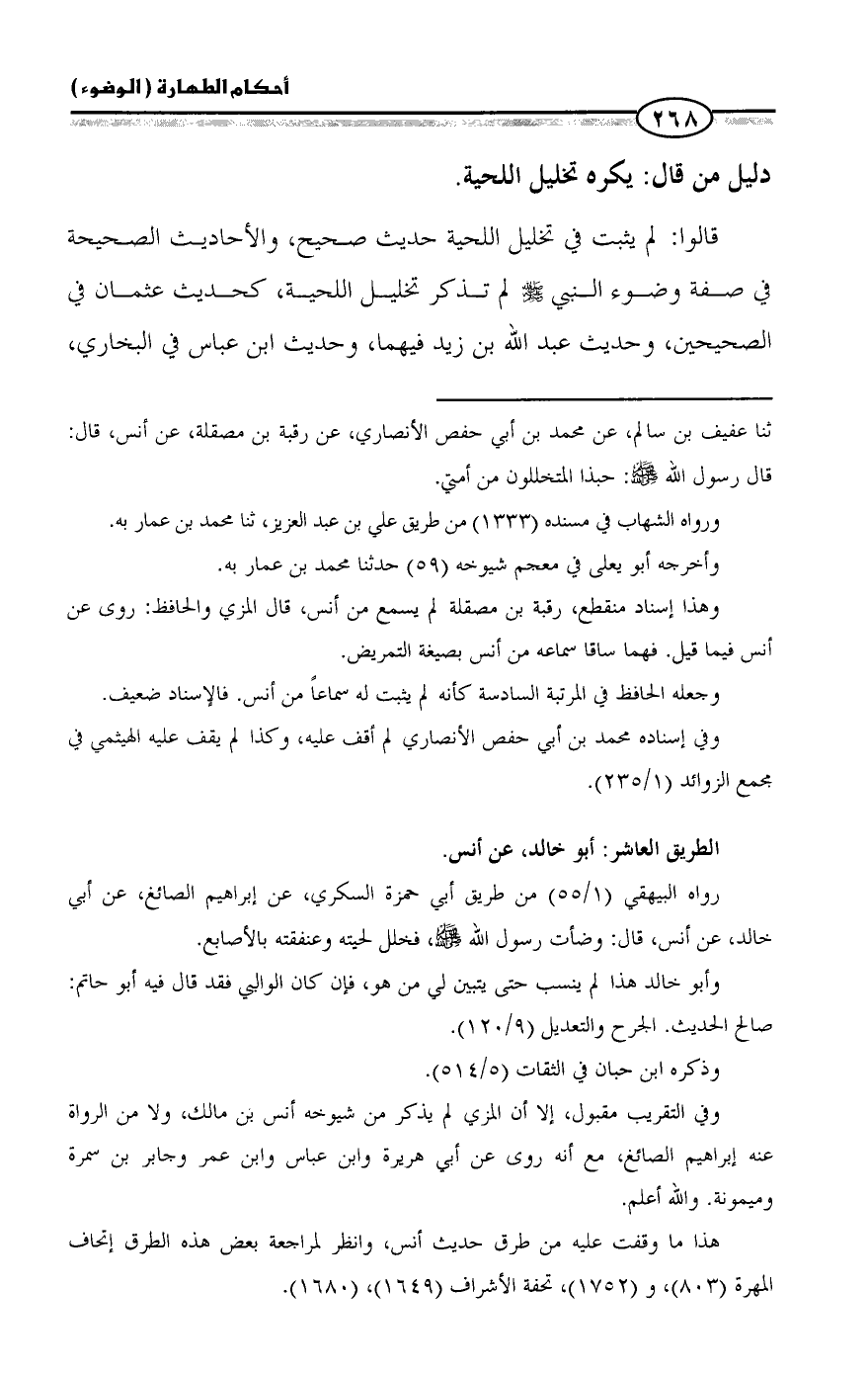 قالوا: لم يثبت في تخليل اللحية حديث صحيح، والأحاديث الصحيحة في صفة وضوء النبي - صلى الله عليه وسلم - لم تذكر تخليل اللحية، كحديث عثمان في الصحيحين، وحديث عبد الله بن زيد فيهما، وحديث ابن عباس في البخاري،