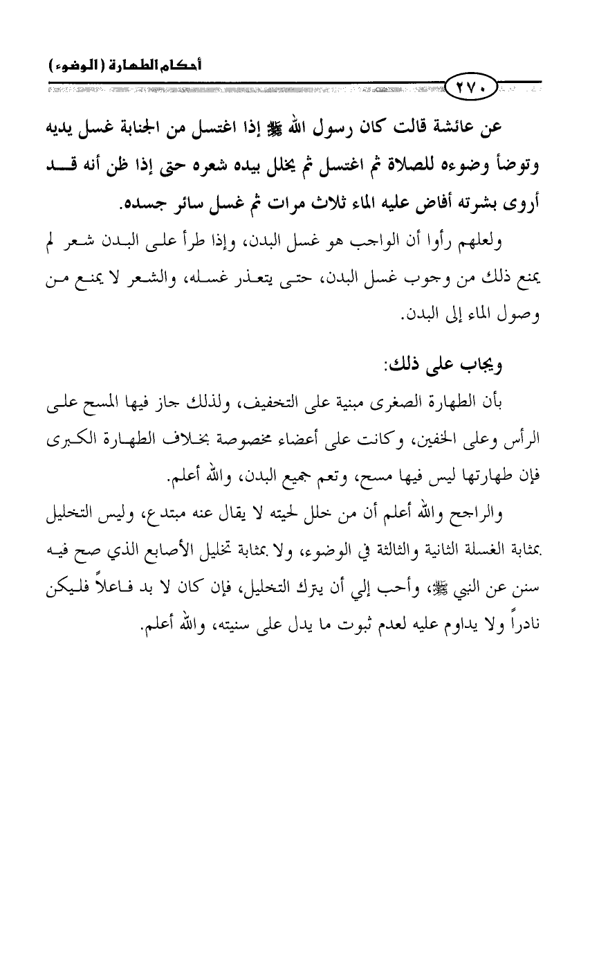 عن عائشة قالت كان رسول الله - صلى الله عليه وسلم - إذا اغتسل من الجنابة غسل يديه وتوضأ وضوءه للصلاة ثم اغتسل ثم يخلل بيده شعره حتى إذا ظن أنه قد أروى بشرته أفاض عليه الماء ثلاث مرات ثم غسل سائر جسده.