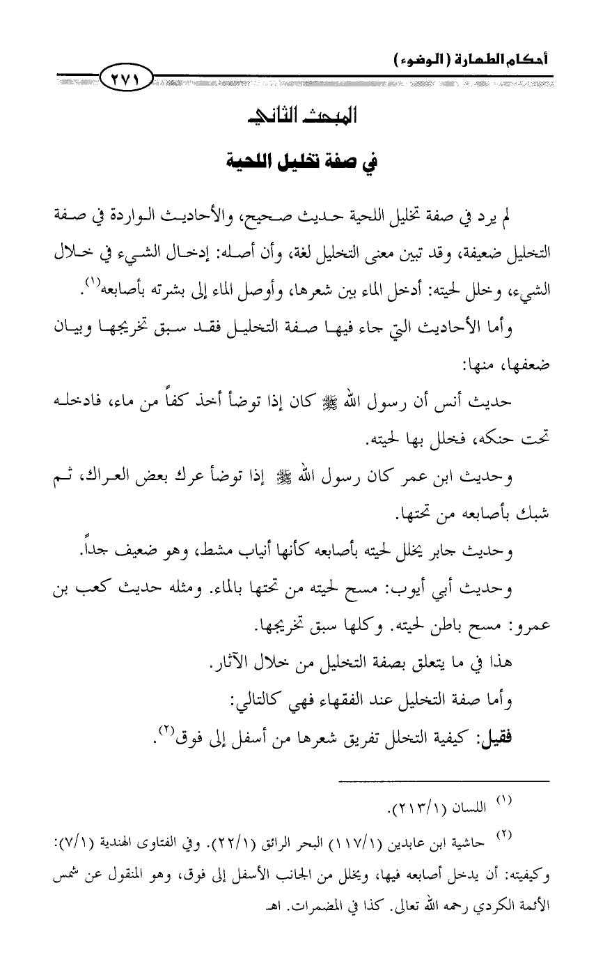 (¬2) حاشية ابن عابدين (1/ 117) البحر الرائق (1/ 22). وفي الفتاوى الهندية (1/ 7): وكيفيته: أن يدخل أصابعه فيها، ويخلل من الجانب الأسفل إلى فوق، وهو المنقول عن شمس الأئمة الكردي رحمه الله تعالى. كذا في المضمرات. اهـ =