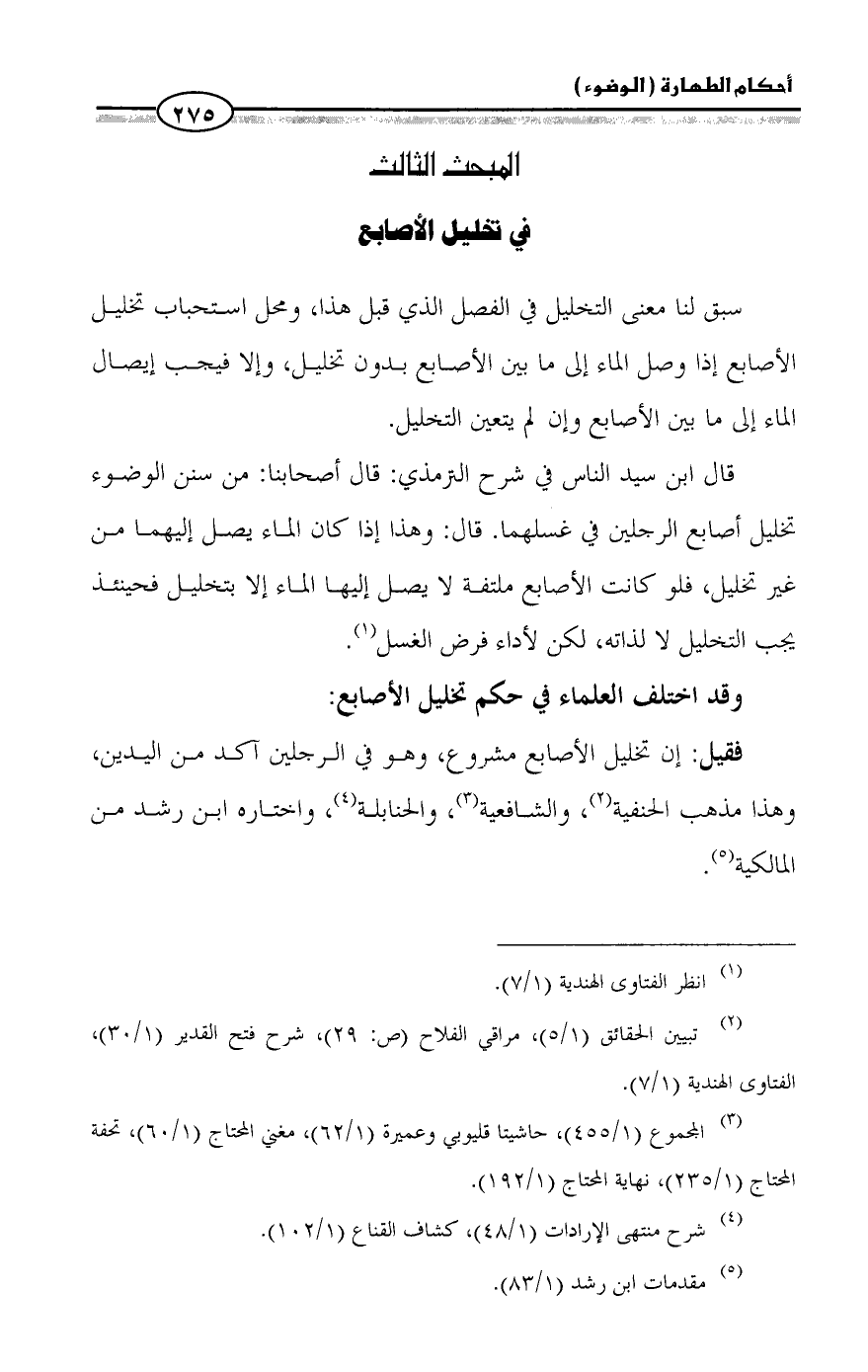 فقيل: إن تخليل الأصابع مشروع، وهو في الرجلين آكد من اليدين، وهذا مذهب الحنفية (¬2)، والشافعية (¬3)، والحنابلة (¬4)، واختاره ابن رشد من المالكية (¬5).