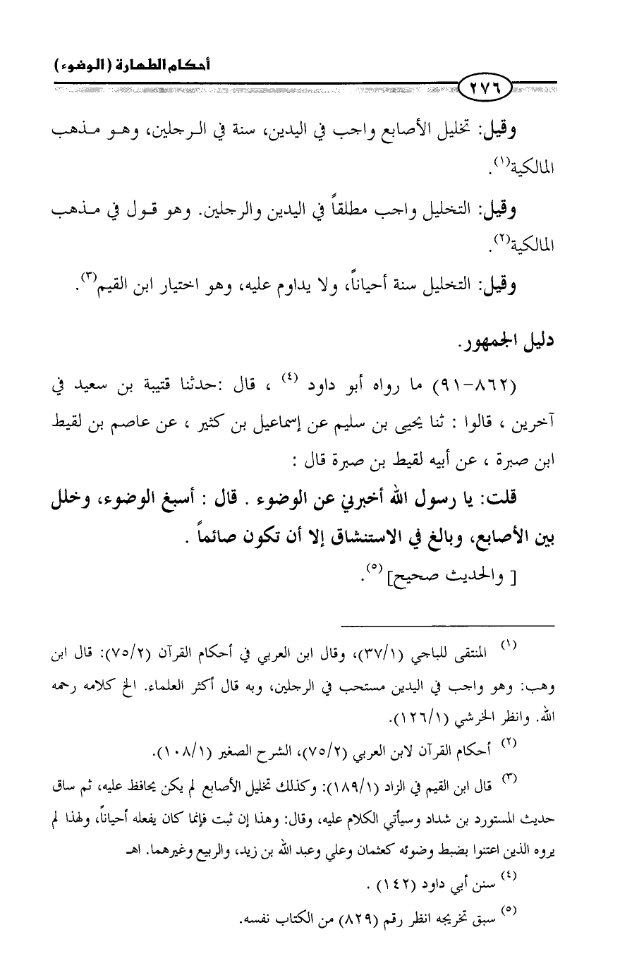(¬1) المنتقى للباجي (1/ 37)، وقال ابن العربي في أحكام القرآن (2/ 75): قال ابن وهب: وهو واجب في اليدين مستحب في الرجلين, وبه قال أكثر العلماء. الخ كلامه رحمه الله. وانظر الخرشي (1/ 126).
