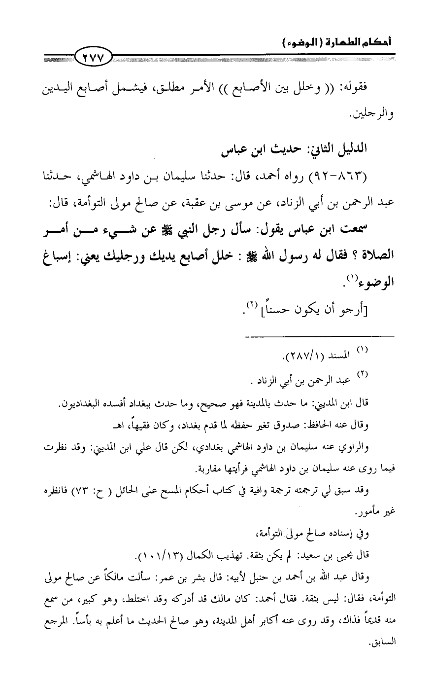 سمعت ابن عباس يقول: سأل رجل النبي - صلى الله عليه وسلم - عن شيء من أمر الصلاة؟ فقال له رسول الله - صلى الله عليه وسلم -: خلل أصابع يديك ورجليك يعني: إسباغ الوضوء (¬1).