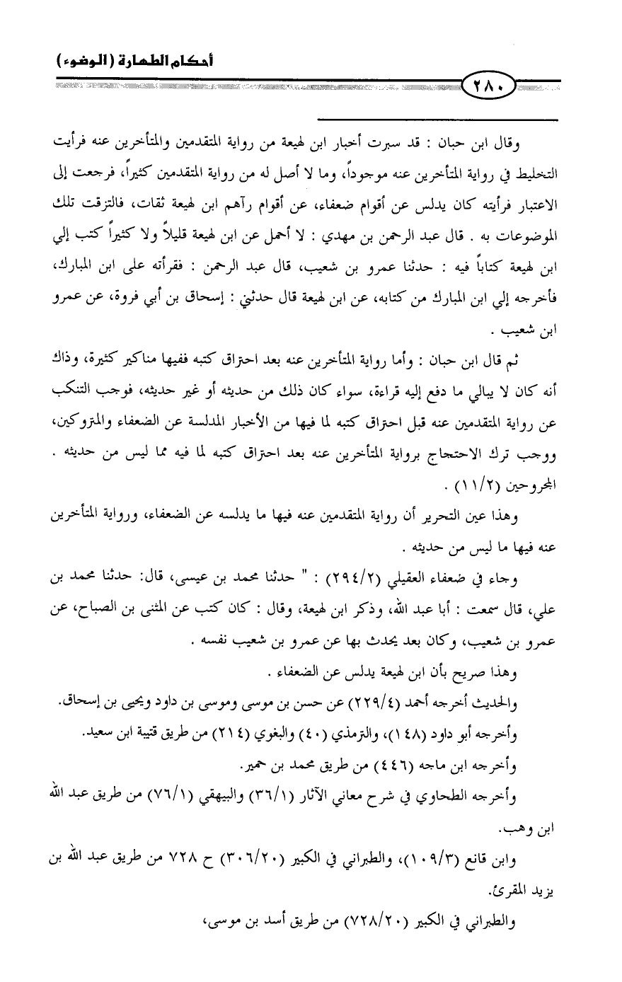 = وقال ابن حبان: قد سبرت أخبار ابن لهيعة من رواية المتقدمين والمتأخرين عنه فرأيت التخليط في رواية المتأخرين عنه موجوداً، وما لا أصل له من رواية المتقدمين كثيراً، فرجعت إلى الاعتبار فرأيته كان يدلس عن أقوام ضعفاء، عن أقوام رآهم ابن لهيعة ثقات، فالتزقت تلك الموضوعات به. قال عبد الرحمن بن مهدي: لا أحمل عن ابن لهيعة قليلاً ولا كثيراً كتب إلي ابن لهيعة كتاباً فيه: حدثنا عمرو بن شعيب، قال عبد الرحمن: فقرأته على ابن المبارك، فأخرجه إلي ابن المبارك من كتابه، عن ابن لهيعة قال حدثني: إسحاق بن أبي فروة، عن عمرو بن شعيب.