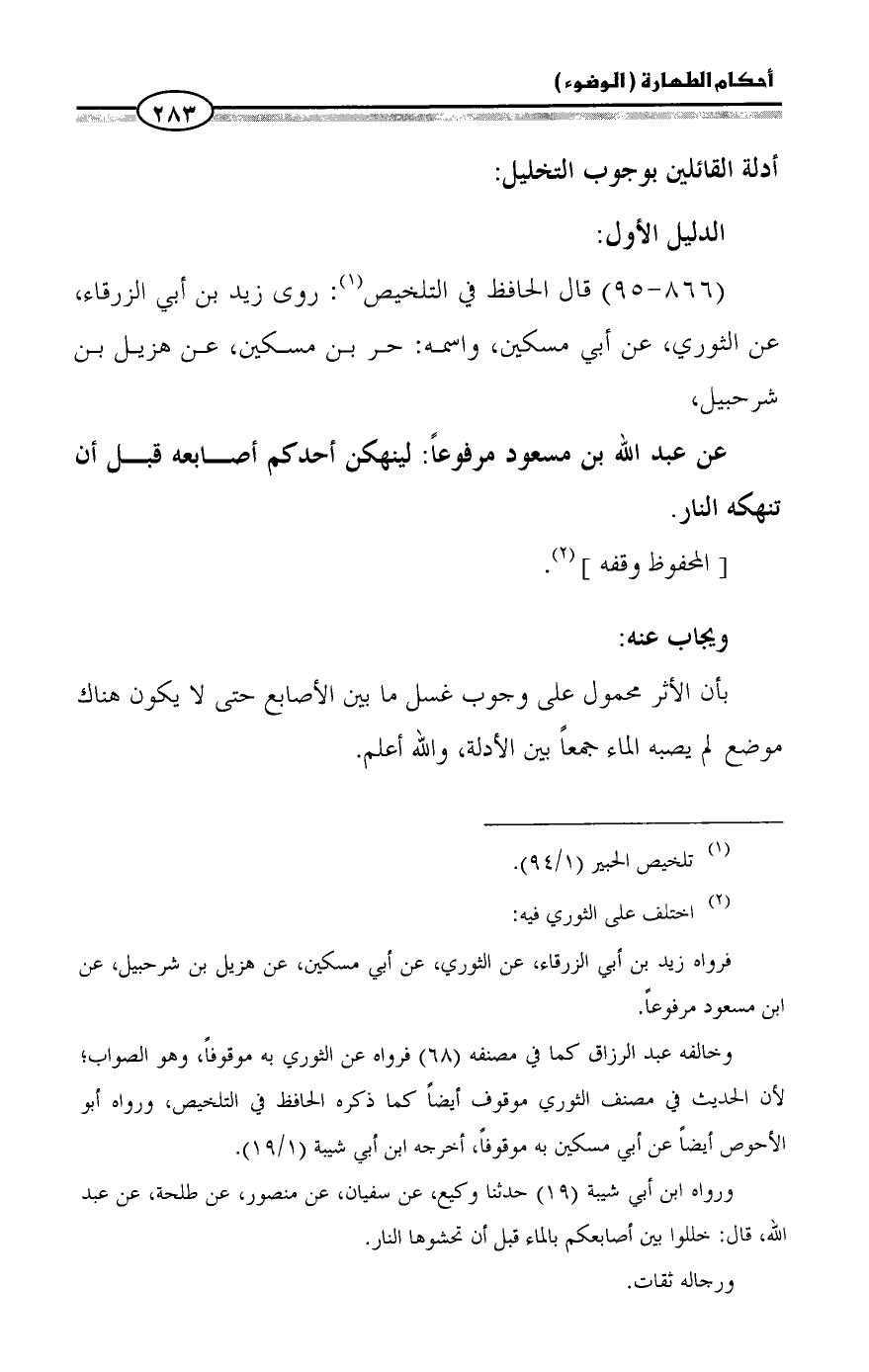 ورواه ابن أبي شيبة (19) حدثنا وكيع، عن سفيان، عن منصور، عن طلحة، عن عبد الله، قال: خللوا بين أصابعكم بالماء قبل أن تحشوها النار.
