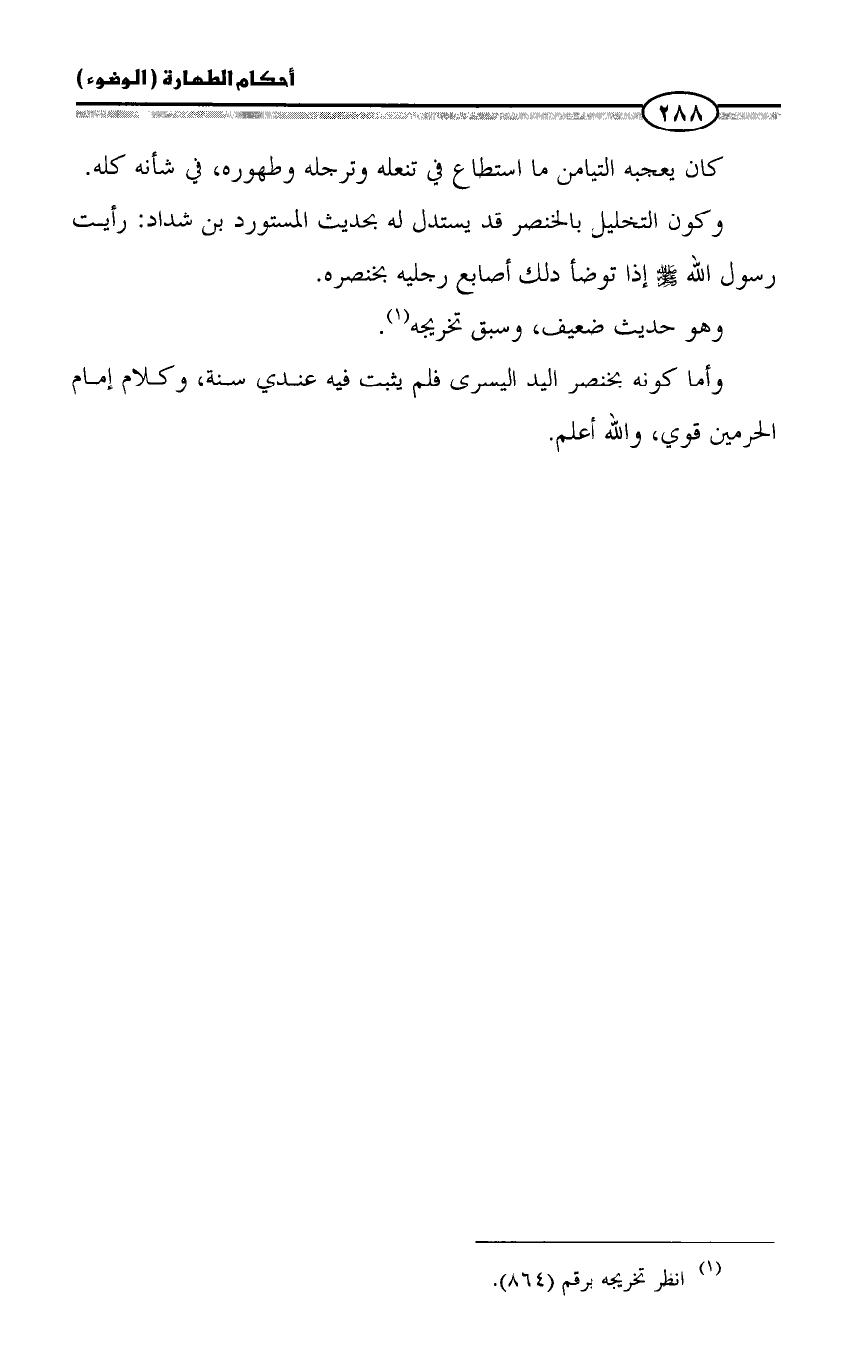 وكون التخليل بالخنصر قد يستدل له بحديث المستورد بن شداد: رأيت رسول الله - صلى الله عليه وسلم - إذا توضأ دلك أصابع رجليه بخنصره.