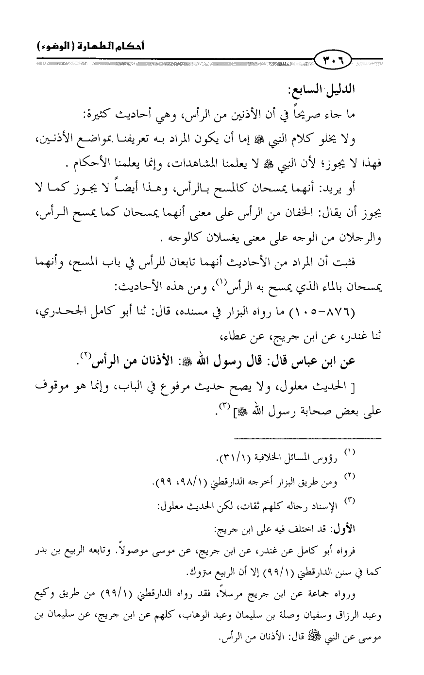 فثبت أن المراد من الأحاديث أنهما تابعان للرأس في باب المسح، وأنهما يمسحان بالماء الذي يمسح به الرأس (¬1)، ومن هذه الأحاديث: