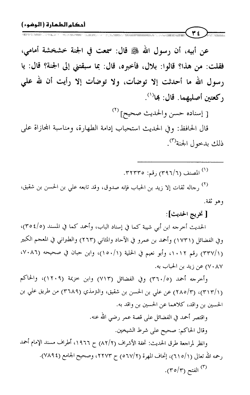 قال الحافظ: وفي الحديث استحباب إدامة الطهارة، ومناسبة المجازاة على ذلك بدخول الجنة (¬3).