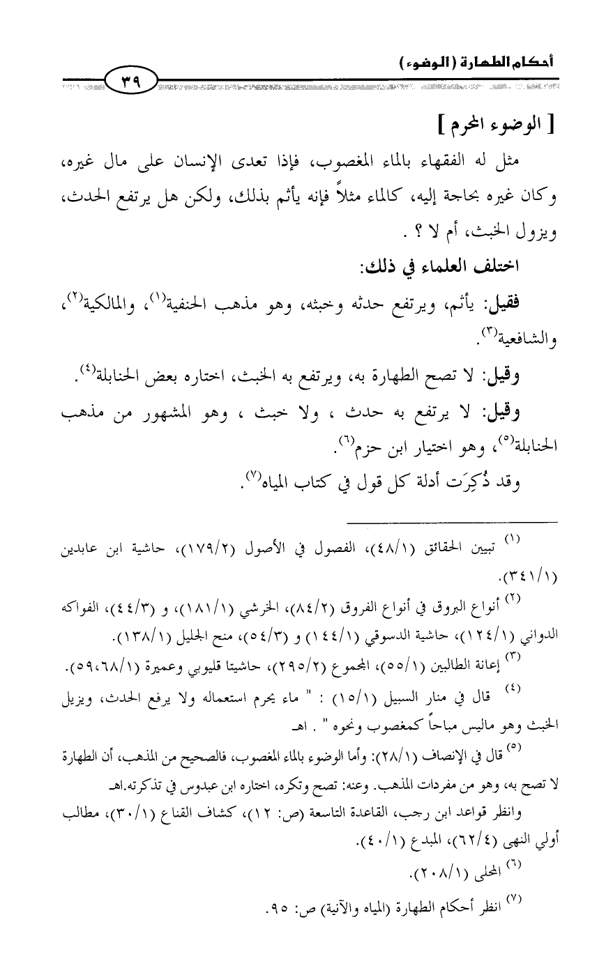 (¬5) قال في الإنصاف (1/ 28): وأما الوضوء بالماء المغصوب، فالصحيح من المذهب، أن الطهارة لا تصح به، وهو من مفردات المذهب. وعنه: تصح وتكره، اختاره ابن عبدوس في تذكرته. اهـ