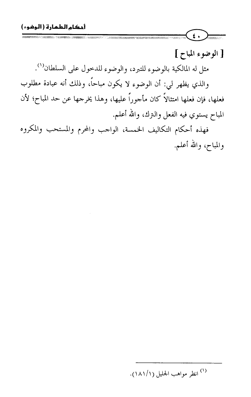 والذي يظهر لي: أن الوضوء لا يكون مباحاً، وذلك أنه عبادة مطلوب فعلها، فإن فعلها امتثالاً كان مأجوراً عليها، وهذا يخرجها عن حد المباح؛ لأن المباح يستوي فيه الفعل والترك، والله أعلم.