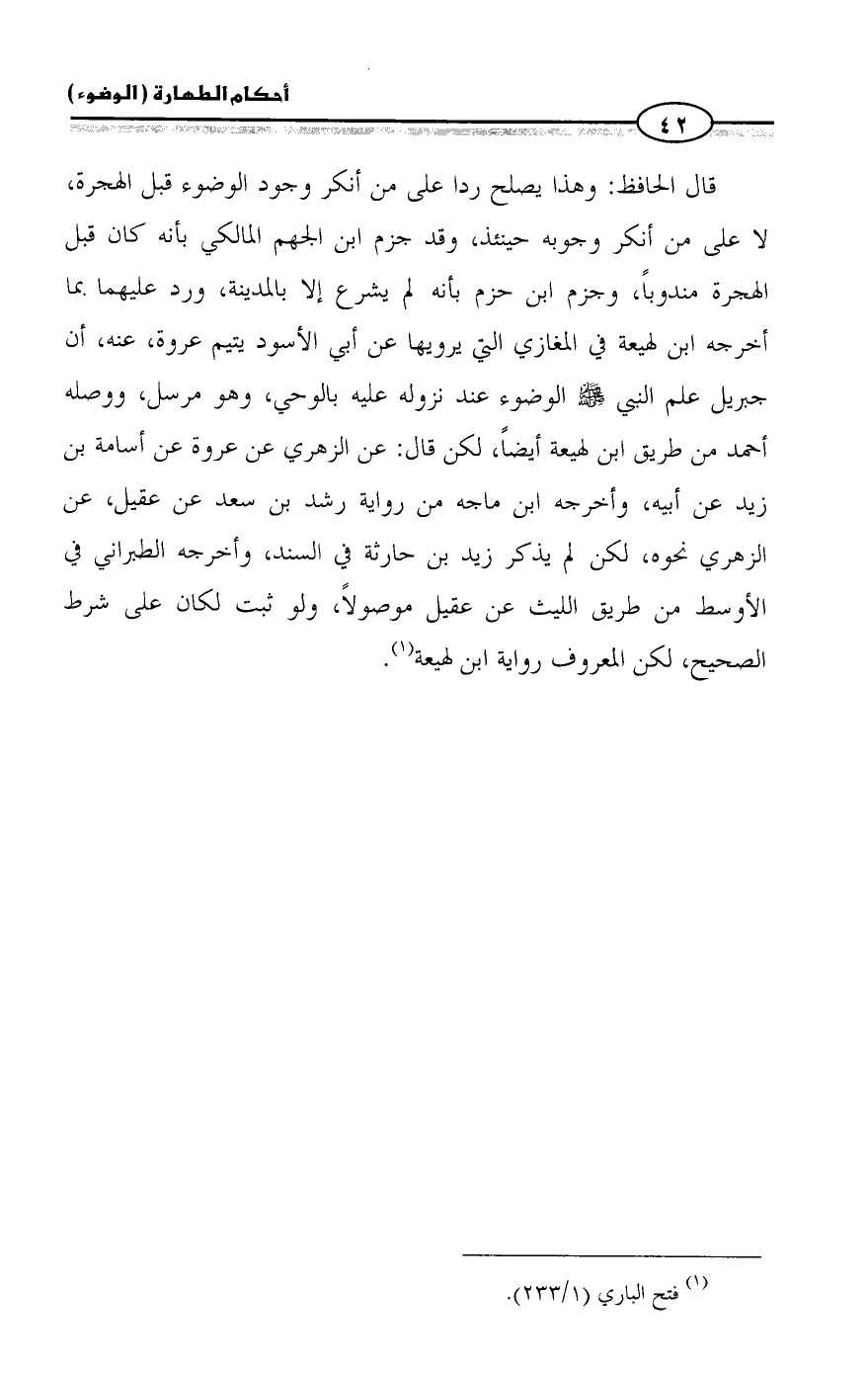 قال الحافظ: وهذا يصلح ردا على من أنكر وجود الوضوء قبل الهجرة، لا على من أنكر وجوبه حينئذ، وقد جزم ابن الجهم المالكي بأنه كان قبل الهجرة مندوباً، وجزم ابن حزم بأنه لم يشرع إلا بالمدينة، ورد عليهما بما أخرجه ابن لهيعة في المغازي التي يرويها عن أبي الأسود يتيم عروة، عنه، أن جبريل علم النبي - صلى الله عليه وسلم - الوضوء عند نزوله عليه بالوحي، وهو مرسل، ووصله أحمد من طريق ابن لهيعة أيضاً، لكن قال: عن الزهري عن عروة عن أسامة بن زيد عن أبيه، وأخرجه ابن ماجه من رواية رشد بن سعد عن عقيل، عن الزهري نحوه، لكن لم يذكر زيد بن حارثة في السند، وأخرجه الطبراني في الأوسط من طريق الليث عن عقيل موصولاً، ولو ثبت لكان على شرط الصحيح، لكن المعروف رواية ابن لهيعة (¬1).