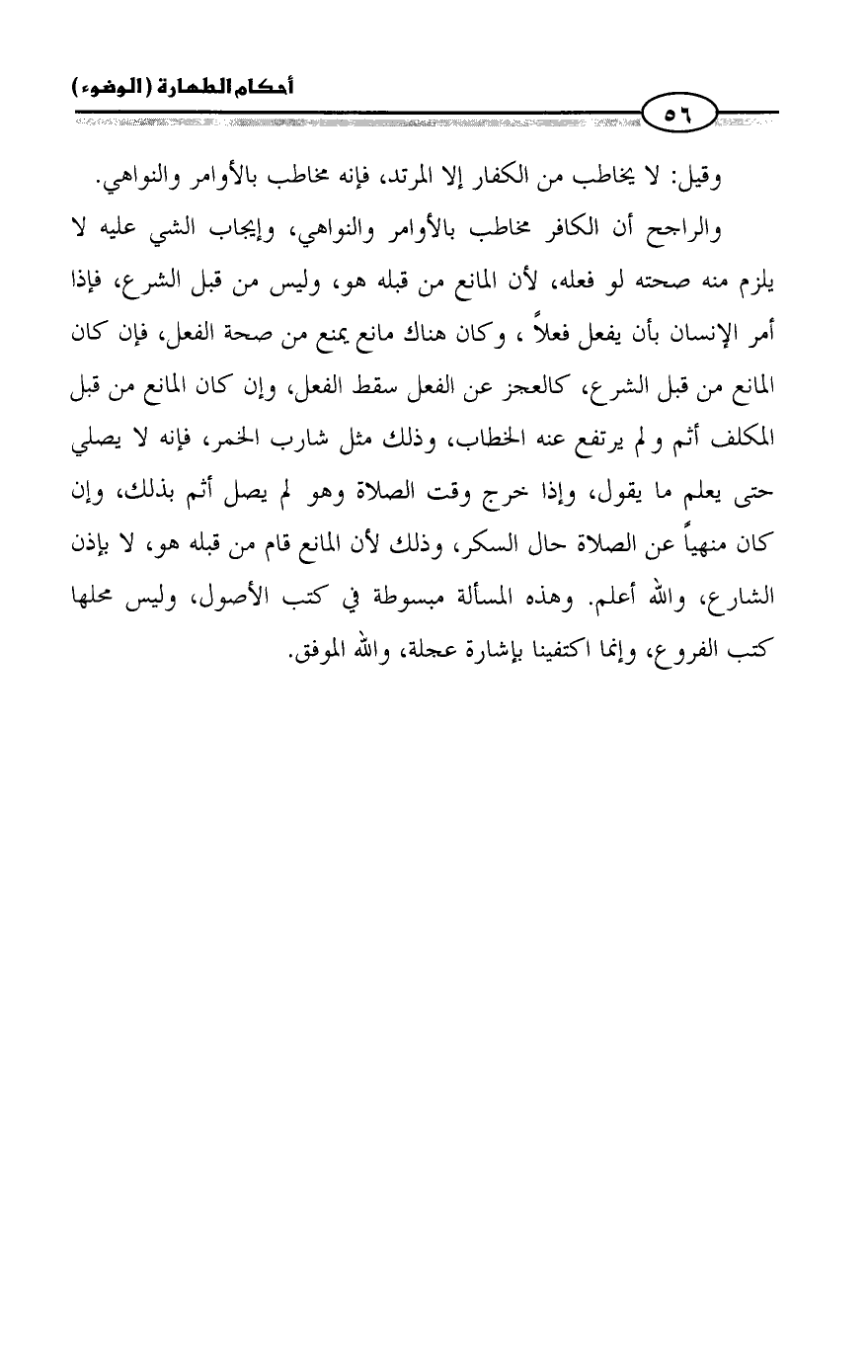 والراجح أن الكافر مخاطب بالأوامر والنواهي، وإيجاب الشي عليه لا يلزم منه صحته لو فعله، لأن المانع من قبله هو، وليس من قبل الشرع، فإذا أمر الإنسان بأن يفعل فعلاً، وكان هناك مانع يمنع من صحة الفعل، فإن كان المانع من قبل الشرع، كالعجز عن الفعل سقط الفعل، وإن كان المانع من قبل المكلف أثم ولم يرتفع عنه الخطاب، وذلك مثل شارب الخمر، فإنه لا يصلي حتى يعلم ما يقول، وإذا خرج وقت الصلاة وهو لم يصل أثم بذلك، وإن كان منهياً عن الصلاة حال السكر، وذلك لأن المانع قام من قبله هو، لا بإذن الشارع، والله أعلم. وهذه المسألة مبسوطة في كتب الأصول، وليس محلها كتب الفروع، وإنما اكتفينا بإشارة عجلة، والله الموفق.