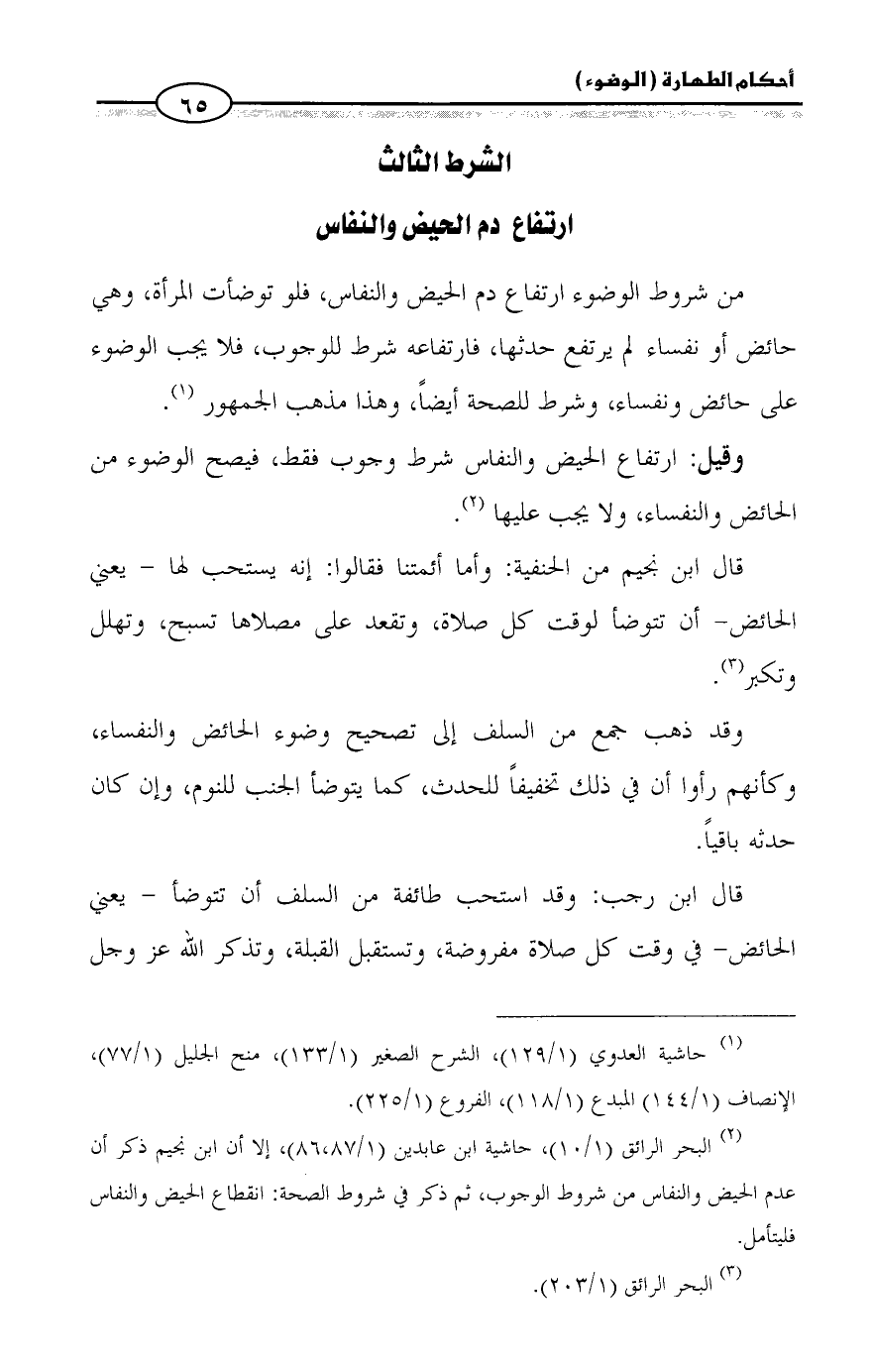 (¬2) البحر الرائق (1/ 10)، حاشية ابن عابدين (1/ 86،87)، إلا أن ابن نجيم ذكر أن عدم الحيض والنفاس من شروط الوجوب، ثم ذكر في شروط الصحة: انقطاع الحيض والنفاس فليتأمل.