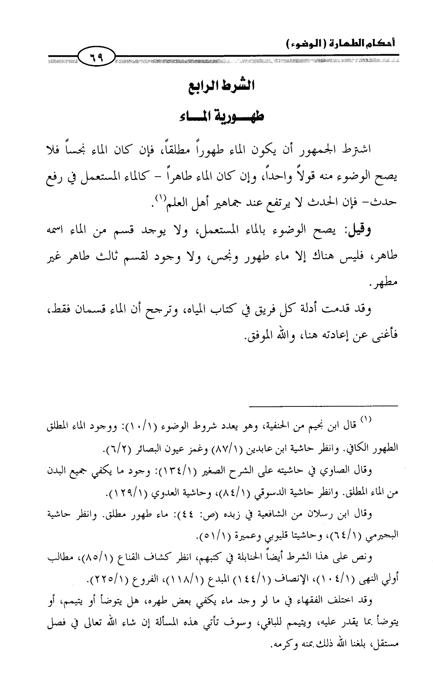 (¬1) قال ابن نجيم من الحنفية، وهو يعدد شروط الوضوء (1/ 10): ووجود الماء المطلق الطهور الكافي. وانظر حاشية ابن عابدين (1/ 87) وغمز عيون البصائر (2/ 6).