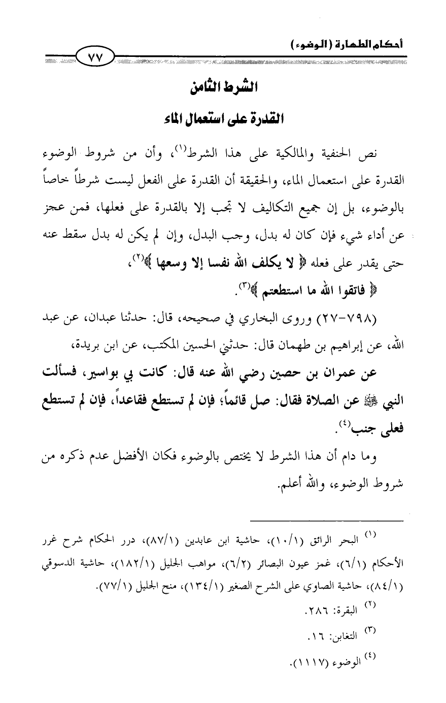 نص الحنفية والمالكية على هذا الشرط (¬1)، وأن من شروط الوضوء القدرة على استعمال الماء، والحقيقة أن القدرة على الفعل ليست شرطاً خاصاً بالوضوء، بل إن جميع التكاليف لا تجب إلا بالقدرة على فعلها، فمن عجز عن أداء شيء فإن كان له بدل، وجب البدل، وإن لم يكن له بدل سقط عنه حتى يقدر على فعله {لا يكلف الله نفسا إلا وسعها} (¬2)،