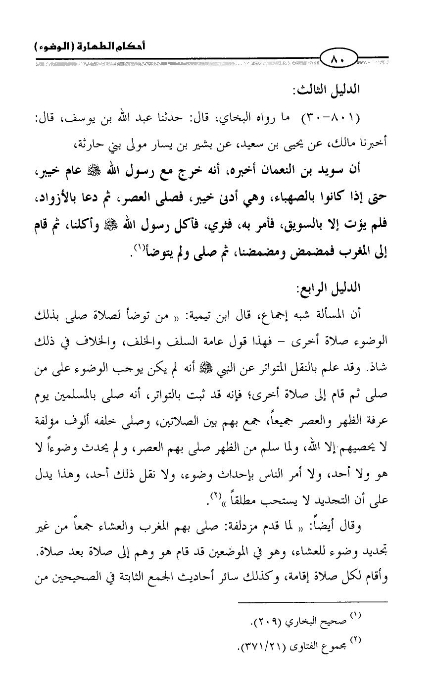 أن المسألة شبه إجماع، قال ابن تيمية: «من توضأ لصلاة صلى بذلك الوضوء صلاة أخرى - فهذا قول عامة السلف والخلف، والخلاف في ذلك شاذ. وقد علم بالنقل المتواتر عن النبي - صلى الله عليه وسلم - أنه لم يكن يوجب الوضوء على من صلى ثم قام إلى صلاة أخرى؛ فإنه قد ثبت بالتواتر، أنه صلى بالمسلمين يوم عرفة الظهر والعصر جميعاً، جمع بهم بين الصلاتين، وصلى خلفه ألوف مؤلفة لا يحصيهم إلا الله، ولما سلم من الظهر صلى بهم العصر، ولم يحدث وضوءاً لا هو ولا أحد، ولا أمر الناس بإحداث وضوء، ولا نقل ذلك أحد، وهذا يدل على أن التجديد لا يستحب مطلقاً» (¬2).