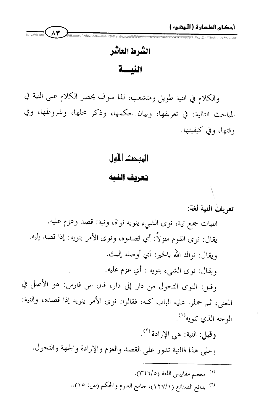 والكلام في النية طويل ومتشعب، لذا سوف يحصر الكلام على النية في المباحث التالية: في تعريفها، وبيان حكمها، وذكر محلها، وشروطها، وفي وقتها، وفي كيفيتها.