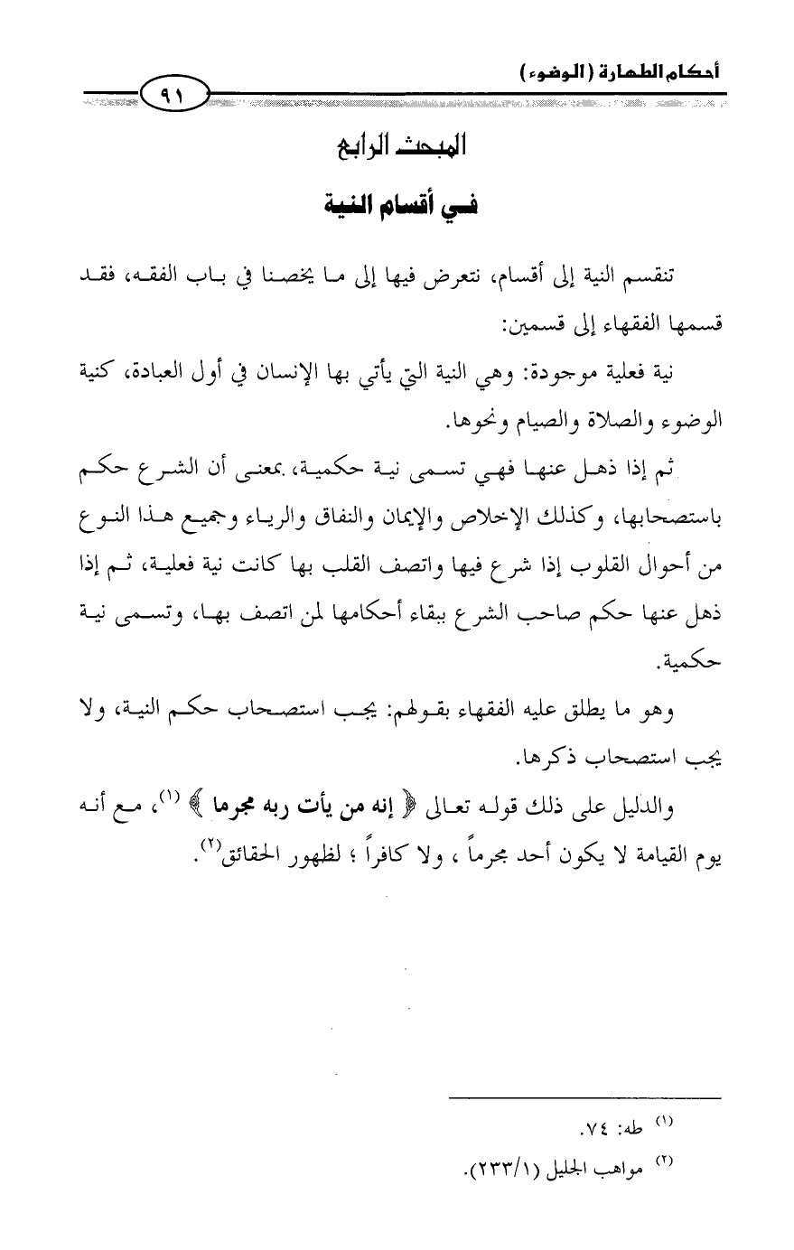 ثم إذا ذهل عنها فهي تسمى نية حكمية، بمعنى أن الشرع حكم باستصحابها، وكذلك الإخلاص والإيمان والنفاق والرياء وجميع هذا النوع من أحوال القلوب إذا شرع فيها واتصف القلب بها كانت نية فعلية, ثم إذا ذهل عنها حكم صاحب الشرع ببقاء أحكامها لمن اتصف بها، وتسمى نية حكمية.