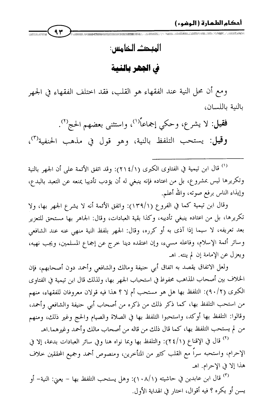 (¬3) قال ابن عابدين في حاشيته (1/ 108): وهل يستحب التلفظ بها - يعني: النية- أو يسن أو يكره؟ فيه أقوال، اختار في الهداية الأول.