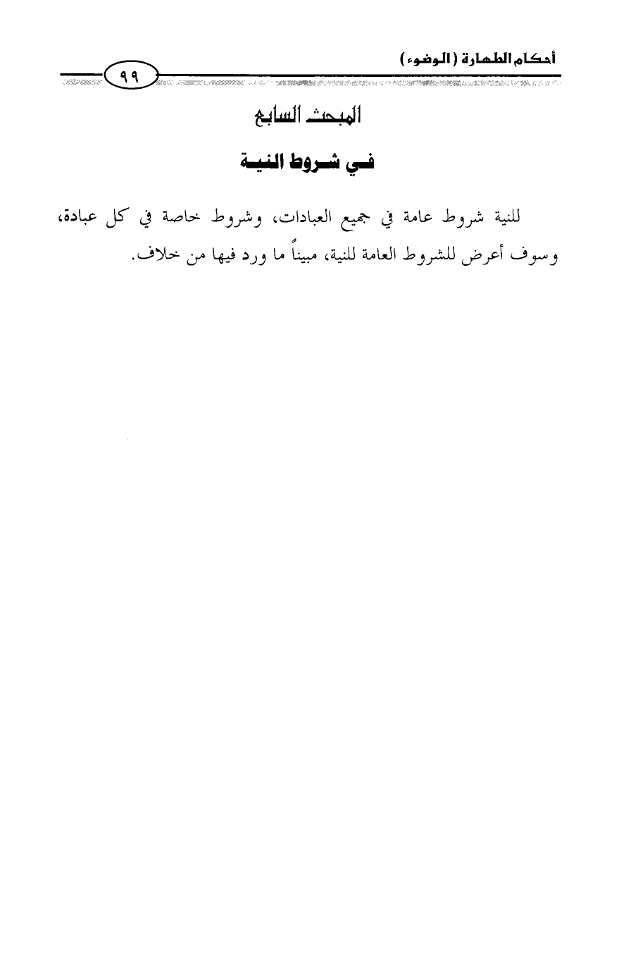 للنية شروط عامة في جميع العبادات، وشروط خاصة في كل عبادة، وسوف أعرض للشروط العامة للنية، مبيناً ما ورد فيها من خلاف.