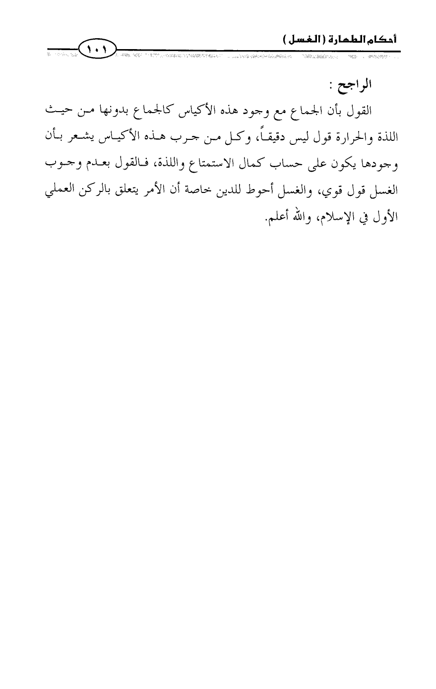 القول بأن الجماع مع وجود هذه الأكياس كالجماع بدونها من حيث اللذة والحرارة قول ليس دقيقاً، وكل من جرب هذه الأكياس يشعر بأن وجودها يكون على حساب كمال الاستمتاع واللذة، فالقول بعدم وجوب الغسل قول قوي، والغسل أحوط للدين خاصة أن الأمر يتعلق بالركن العملي الأول في الإسلام، والله أعلم.