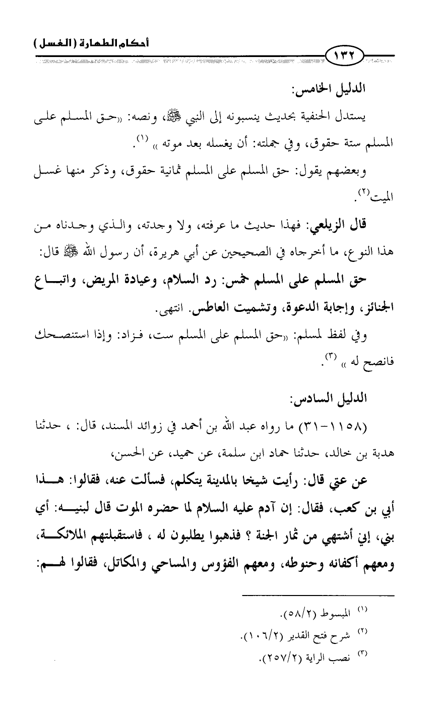 يستدل الحنفية بحديث ينسبونه إلى النبي - صلى الله عليه وسلم -، ونصه: «حق المسلم على المسلم ستة حقوق، وفي جملته: أن يغسله بعد موته» (¬1).