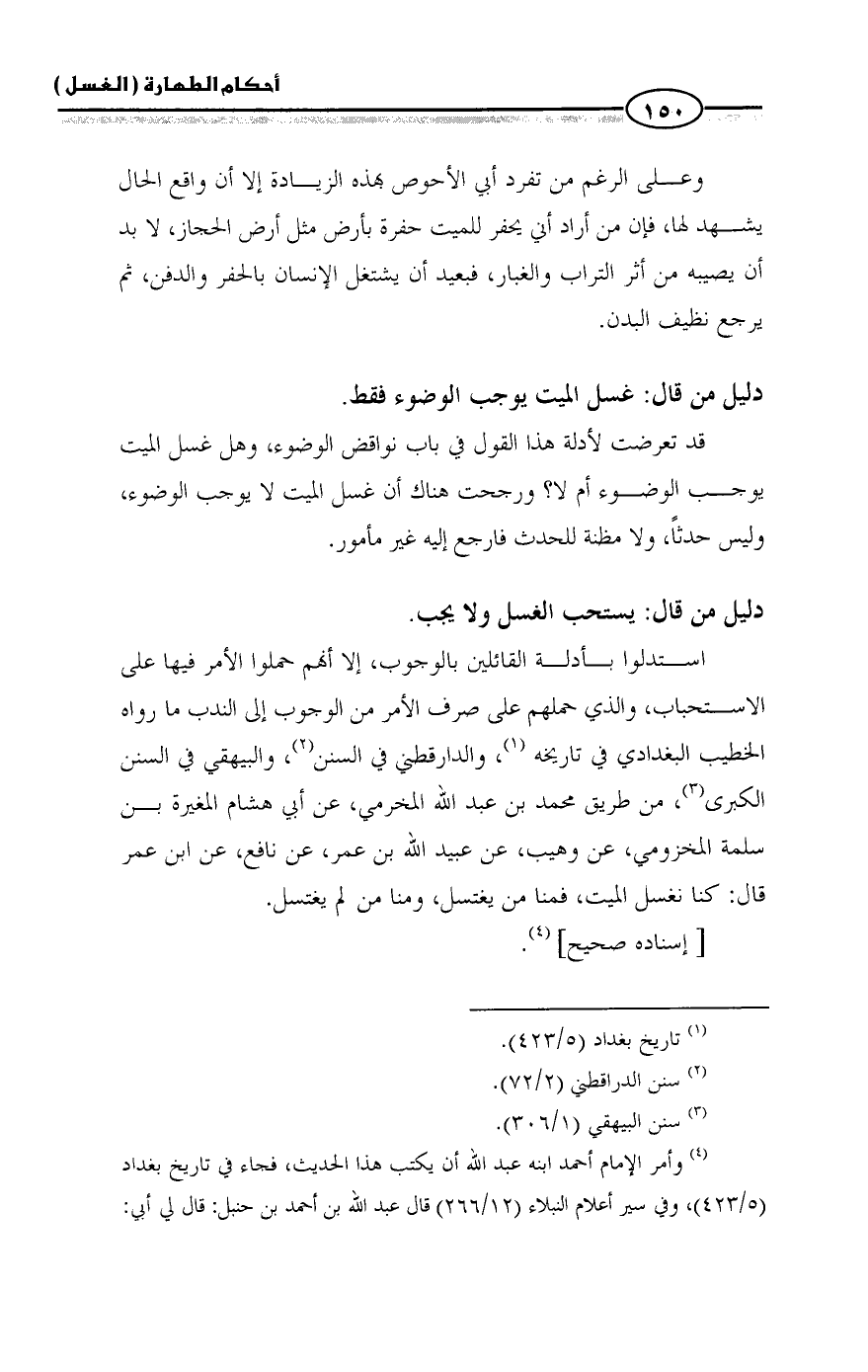 استدلوا بأدلة القائلين بالوجوب، إلا أنهم حملوا الأمر فيها على الاستحباب، والذي حملهم على صرف الأمر من الوجوب إلى الندب ما رواه الخطيب البغدادي في تاريخه (¬1)، والدارقطني في السنن (¬2)، والبيهقي في السنن الكبرى (¬3)، من طريق محمد بن عبد الله المخرمي، عن أبي هشام المغيرة بن سلمة المخزومي، عن وهيب، عن عبيد الله بن عمر، عن نافع، عن ابن عمر قال: كنا نغسل الميت، فمنا من يغتسل، ومنا من لم يغتسل.