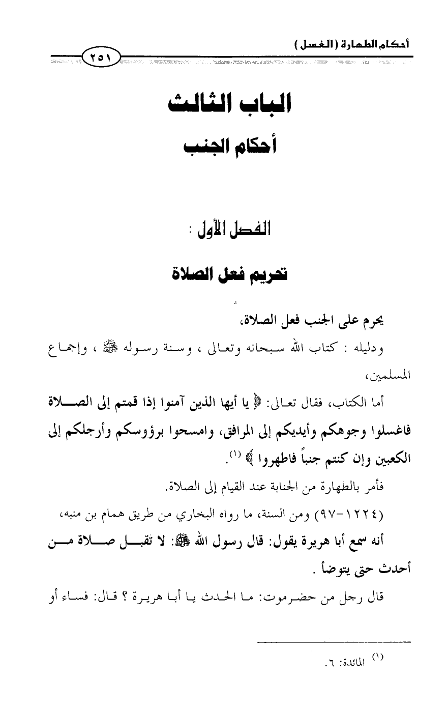 أما الكتاب، فقال تعالى: {يا أيها الذين آمنوا إذا قمتم إلى الصلاة فاغسلوا وجوهكم وأيديكم إلى المرافق، وامسحوا برؤوسكم وأرجلكم إلى الكعبين وإن كنتم جنباً فاطهروا} (¬1).