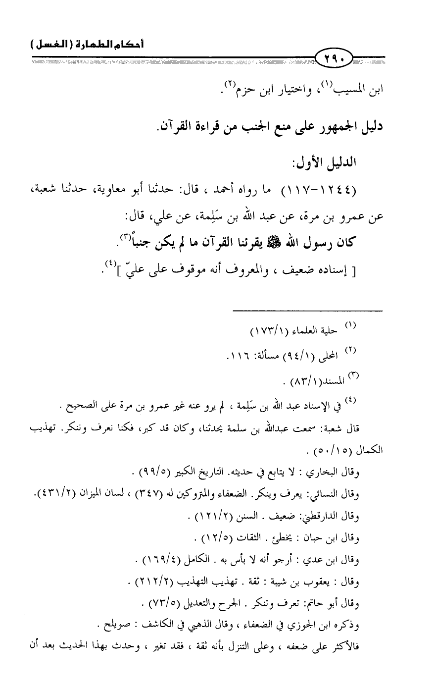 (1244 - 117) ما رواه أحمد، قال: حدثنا أبو معاوية، حدثنا شعبة، عن عمرو بن مرة، عن عبد الله بن سَلِمة، عن علي، قال: