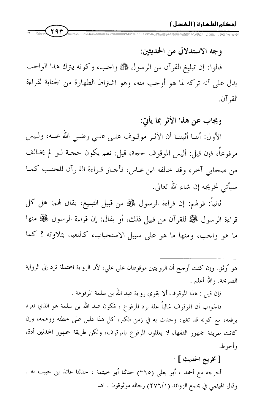 الأول: أننا أثبتنا أن الأثر موقوف على علي رضي الله عنه، وليس مرفوعاً، فإن قيل: أليس الموقوف حجة، قيل: نعم يكون حجة لو لم يخالف من صحابي آخر، وقد خالفه ابن عباس، فأجاز قراءة القرآن للجنب كما سيأتي تخريجه إن شاء الله تعالى.