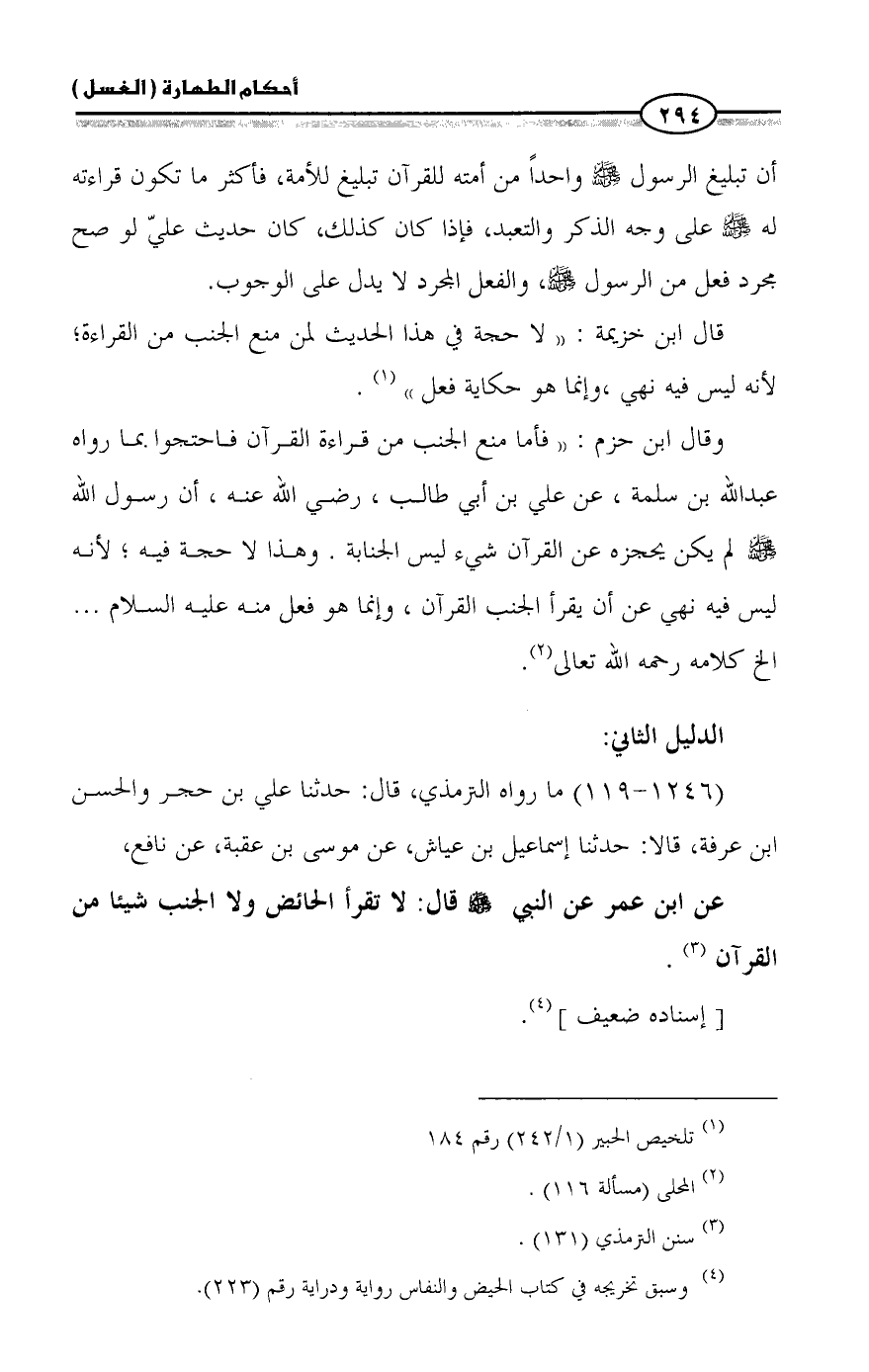 وقال ابن حزم: ((فأما منع الجنب من قراءة القرآن فاحتجوا بما رواه عبد الله بن سلمة، عن علي بن أبي طالب، رضي الله عنه، أن رسول الله - صلى الله عليه وسلم - لم يكن يحجزه عن القرآن شيء ليس الجنابة. وهذا لا حجة فيه؛ لأنه ليس فيه نهي عن أن يقرأ الجنب القرآن، وإنما هو فعل منه عليه السلام ... الخ كلامه رحمه الله تعالى (¬2).